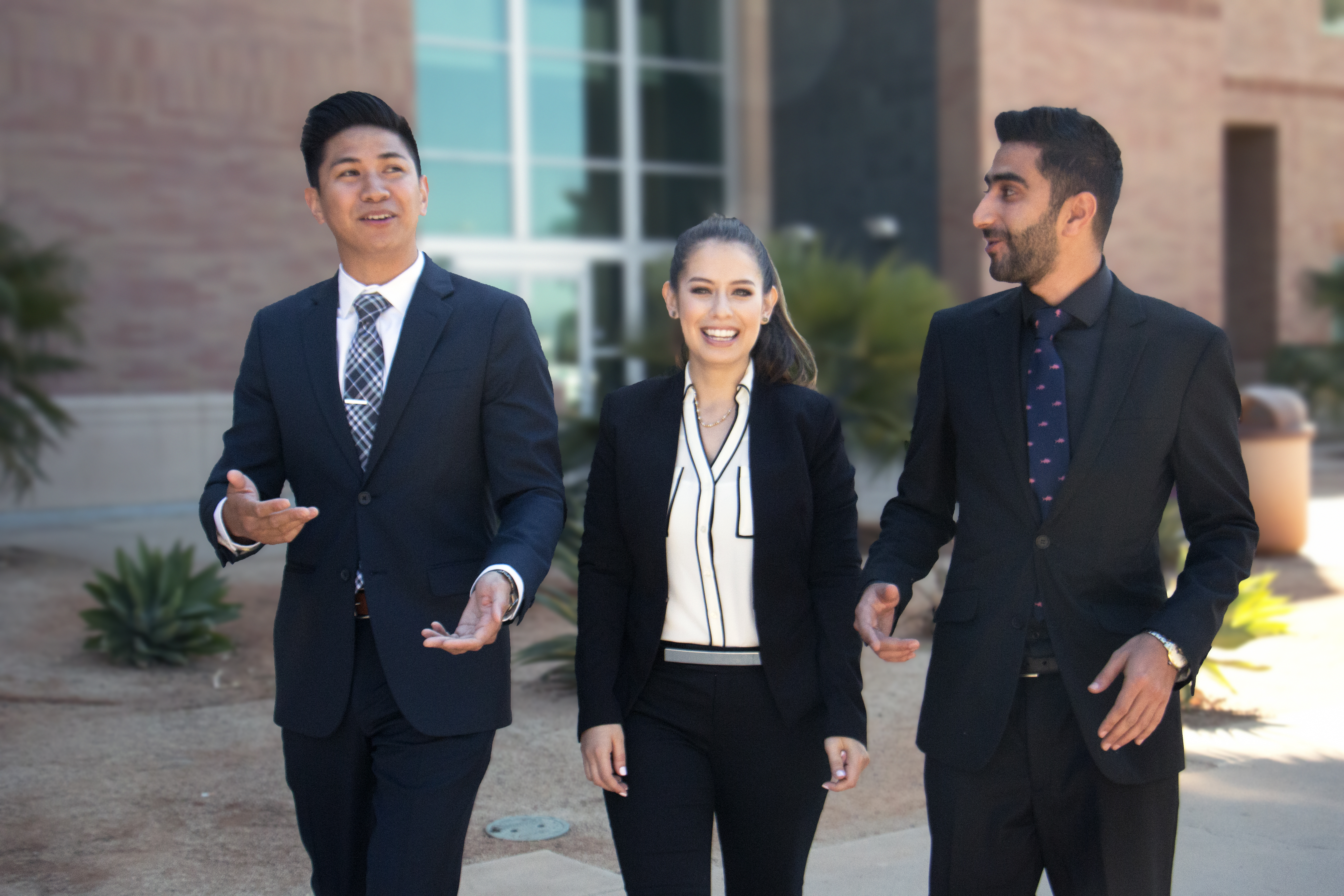 Three Business Students in Suits Walking Campus